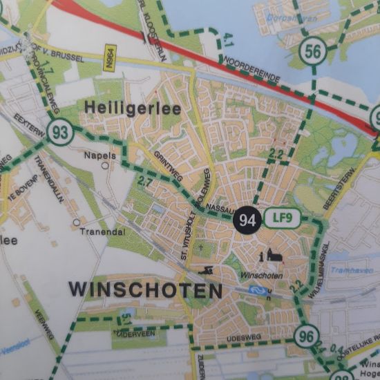 Dit is de plattegrond van Winschoten op de borden van de fietsknooppunten, en ik vind het een goed bord omdat de Marktpleinkerk er goed op staat aangegeven, alsmede het zwembad, en daar tussenin, boven het station is het Sterrebos herkenbaar.