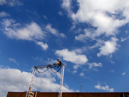 Hoog in de lucht, en het topje van de Winschoter Toren er bij.
