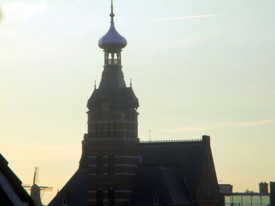 Ik begin met het uitzicht vanaf mijn balkon, er speelt iemand op het carillon, en ze zijn bezig met het slopen van de voormalige bibliotheek, en in de verte zie ik de molen draaien.