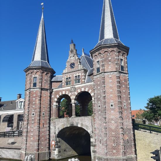 En in Sneek natuurlijk rechtreeks naar het symbool van de stad, de Waterpoort en wie goed kijkt ziet ook een watertoren. En bloemen. En fietsers.