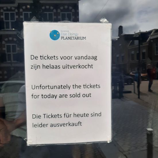 Op donderdag werden de fietsen weer opgehaald, dus gingen we op vrijdag met de auto naar Franeker. Ik keek een dag van tevoren op de website van het Planetarium en zag dat je alleen online een kaartje kon kopen. Mijn plan was om er naar toe te gaan en aldaar aan de kassa een kaartje te kopen.