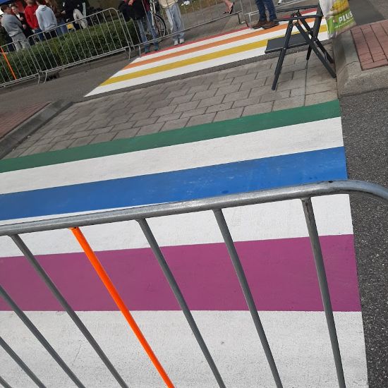 Leuk aan het regenboogzebrapad in Winschoten vind ik dat die niet bij het station is, maar op de Stikkerlaan bij de ingang van het Stadspark en Rosarium, nabij de grootste zwerfkei van 30 ton naast de start van het fietspad naar Blauwestad over de langste fietsbrug van Europa.