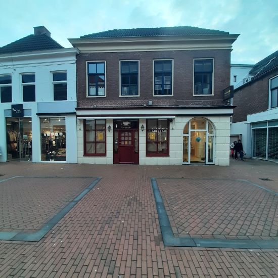 De rode deur en de twee rode raamkozijnen, dat is een broodjeszaak, en onder de boog door aan de rechterkant is een reisburo.