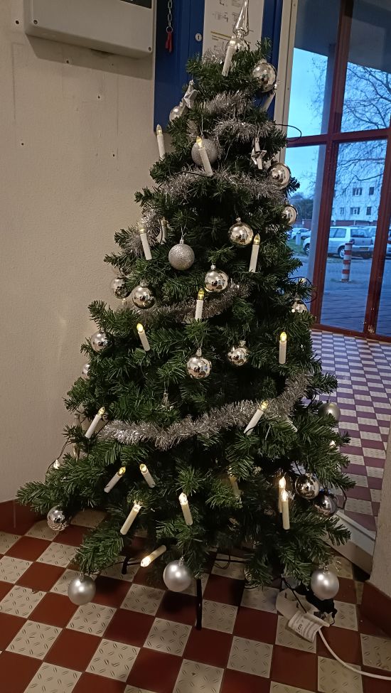 Hier de eerste kerstboom die ik tegen kom als ik het huis uit ga.