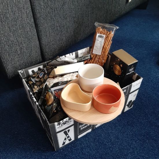 Dit was dit jaar mijn kerstpakket, het zat vol met koek en snoep en chips en een leuke plank met schaaltjes.